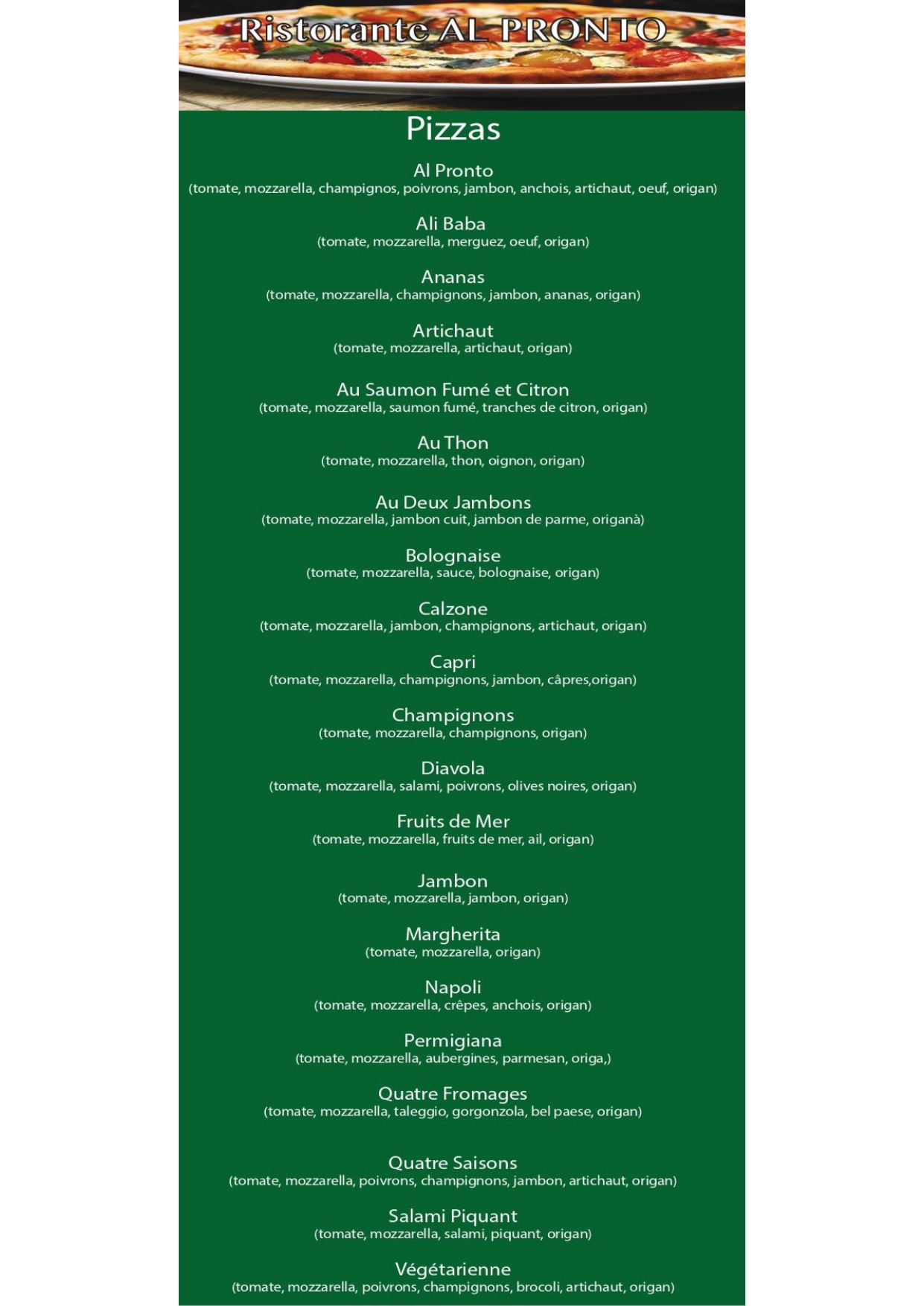 Bienvenue dans notre charmante pizzeria AL PRONTO, un véritable coin de l’Italie au cœur de la ville. Dès que vous franchissez la porte, l’arôme enivrant de la cuisine italienne vous accueille, transportant vos sens dans une expérience gastronomique authentique. Les murs sont ornés de clichés pittoresques de villages italiens pittoresques, créant une atmosphère chaleureuse et conviviale. Notre menu propose une sélection alléchante de pizzas cuites au four à bois, avec des croûtes croustillantes et des garnitures fraîches soigneusement choisies.